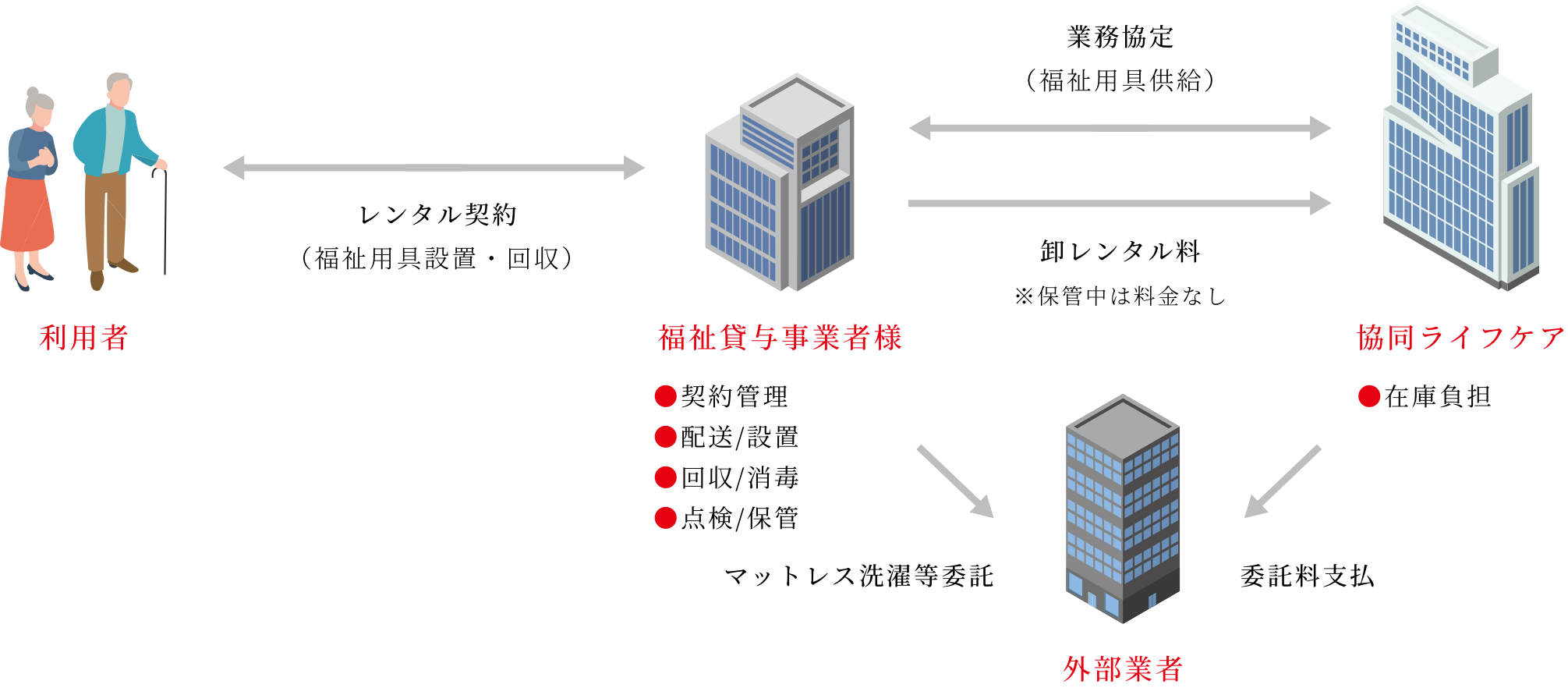 常に一定の必要在庫をレンタル事業者に保管していただきます。そのため利用者からの急な依頼にも迅速に対応でき、競合事業者に対して有利な営業展開が可能になります。